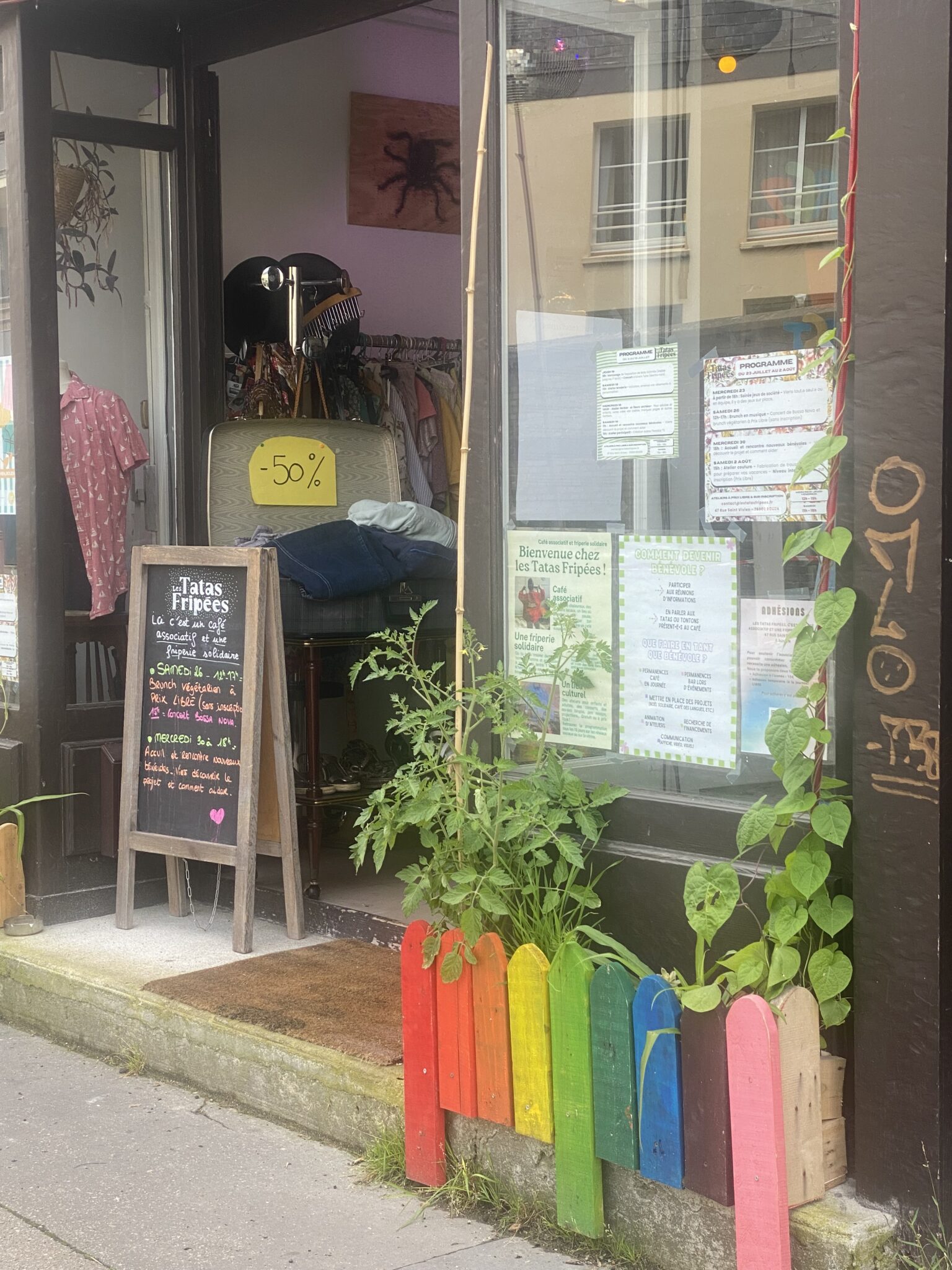 Dès la façade, le ton est donné : une ancienne mallette ouverte déborde de jeans affichés à -50 %, un petit jardinet aux couleurs arc-en-ciel et le programme de la semaine : soirées jeux de société, concerts, brunch, annoncent une effervescence joyeuse et accessible.