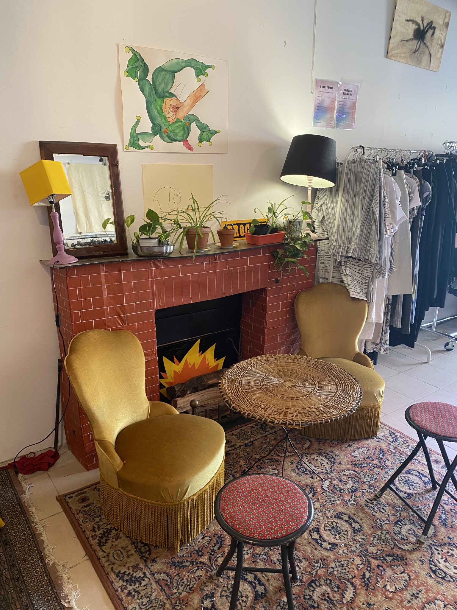 Sur la droite, une cheminée factice aux flammes imaginaires, deux fauteuils ocres et un tapis composent un coin cosy qui invite à s’attarder. On peut s’y installer pour apprendre à réparer un vêtement ou tout simplement prendre le temps de rencontrer l’autre.