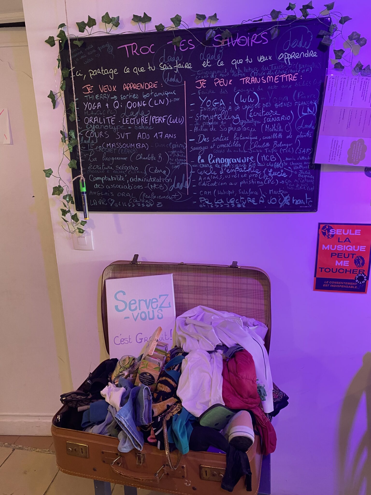 Depuis, Les Tatas Fripées s’attachent à multiplier les initiatives favorisant la rencontre, à l’image du tableau de « troc des savoirs ». Celui-ci met en lien des personnes qui proposent des compétences et d’autres qui en recherchent comme par exemple : des cours de yoga, des cours de SVT pour ados ou encore de la linogravure.