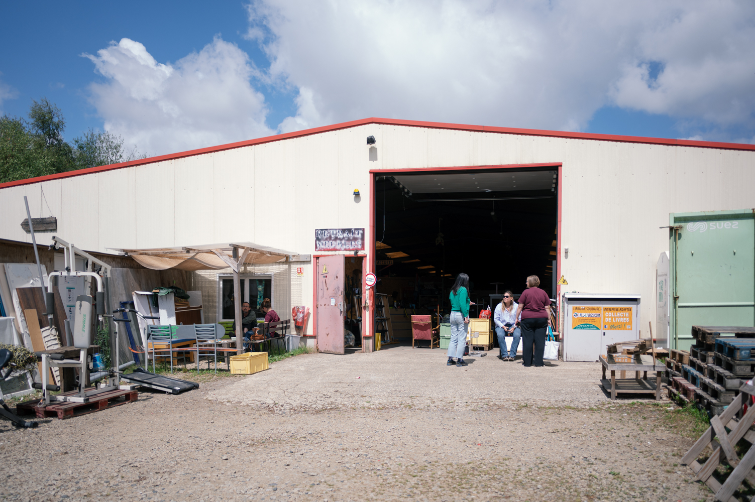 Sur la route de Trouville, rien ne laisse présager ce qui se cache derrière les arbres qui longent le trottoir. Et pourtant, en s’aventurant derrière cette zone discrète, un bâtiment affiche fièrement ses façades colorées. Peintes à la main, vives et généreuses, elles dessinent les contours d’un lieu atypique. Chaque couleur signale un espace, chaque détail raconte une histoire collective. C’est un endroit qu’on découvre avec étonnement, fait de récup’, d’ingéniosité et de chaleur humaine. Ici, on ne vient pas seulement déposer un objet ou chiner une trouvaille : on entre dans un lieu où l’on questionne nos habitudes, où l’on imagine d’autres manières de consommer, de produire et de vivre ensemble.