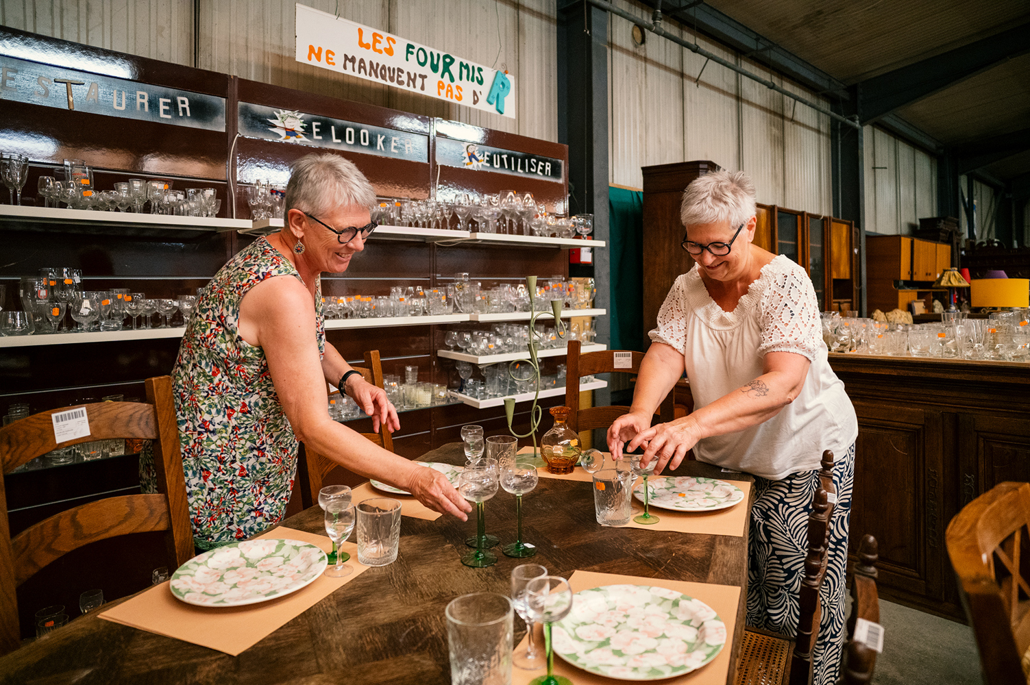 Aujourd’hui, Les Fourmis Vertes, c’est une équipe de 10 salariés (5 ETP) dont 5 postes en insertion, 45 bénévoles et une vingtaine de stagiaires chaque mois. Mais l’essence même du projet reste la mobilisation citoyenne. « Si demain les bénévoles s’arrêtent, la ressourcerie s’arrête », rappelle Morgane. Ici, on donne des objets, certes, mais aussi de son temps. Chacun s’implique selon ses envies et disponibilités : des temps de convivialité rythment la semaine, et chaque journée commence autour d’un café partagé. Evelyne et Lili, bénévoles fidèles, reviennent chaque mercredi : « Nous, ce qu’on aime, c’est la déco… et se retrouver ! », confient-elles avec enthousiasme.