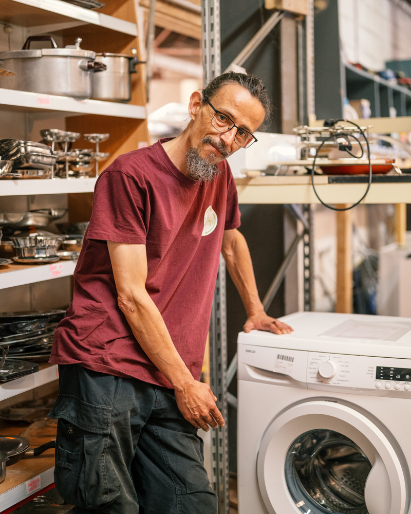Salarié depuis 1 an et demi, Greg travaille aux côtés de Patrick, bénévole depuis le premier jour. Ils testent et réparent les machines à laver, récupérées notamment dans les grandes enseignes, dans le cadre des engagements d’Écosystème en faveur du réemploi.
